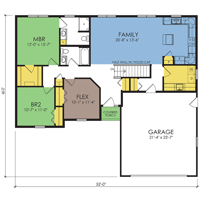 A part of our dream series, the tamarack floor plan features 3 bedrooms and 1.5 bathrooms with a foot print of 44x30 feet and 1342 total square feet of living space.