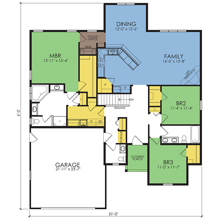 A part of our Wausau Originals, the Dixon floor plan features 3 bedrooms and 2.5 bathrooms with a foot print of 51x61 feet and 1938 total square feet of living space. Floor Plan #WO414