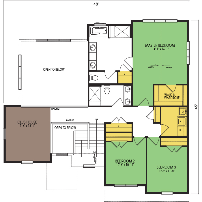 A part of our Vacation Series, the Eau Pleine floor plan features 3 bedrooms and 2.5 bathrooms with a foot print of 48x46 feet and 2567 total square feet of living space. Floor Plan #VL261