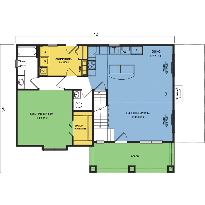 A part of our dream series, the tamarack floor plan features 3 bedrooms and 1.5 bathrooms with a foot print of 44x30 feet and 1342 total square feet of living space.