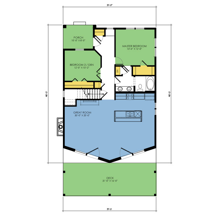 A part of our dream series, the tamarack floor plan features 3 bedrooms and 1.5 bathrooms with a foot print of 44x30 feet and 1342 total square feet of living space.