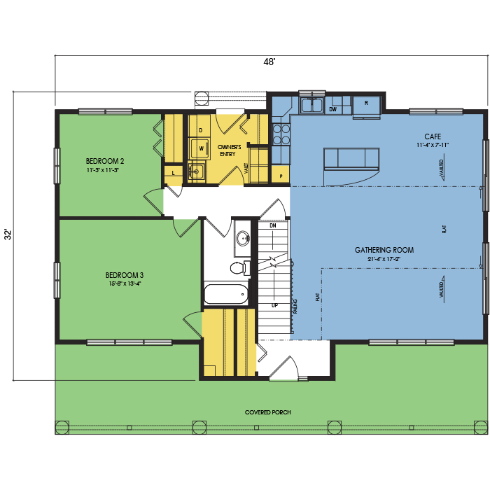 A part of our dream series, the tamarack floor plan features 3 bedrooms and 1.5 bathrooms with a foot print of 44x30 feet and 1342 total square feet of living space.