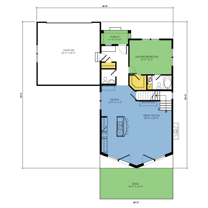 A part of our dream series, the tamarack floor plan features 3 bedrooms and 1.5 bathrooms with a foot print of 44x30 feet and 1342 total square feet of living space.
