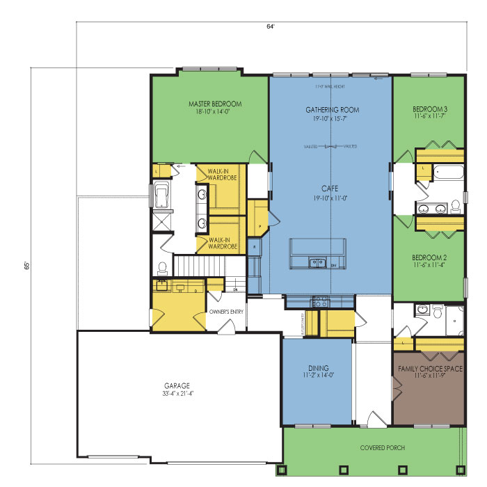 A part of our Architect series, the Sydney 1 story floor plan features 3 bedrooms and 3 bathrooms with a footprint of 64x65 feet and 2700 total square feet of living space. Floor Plan #AR100