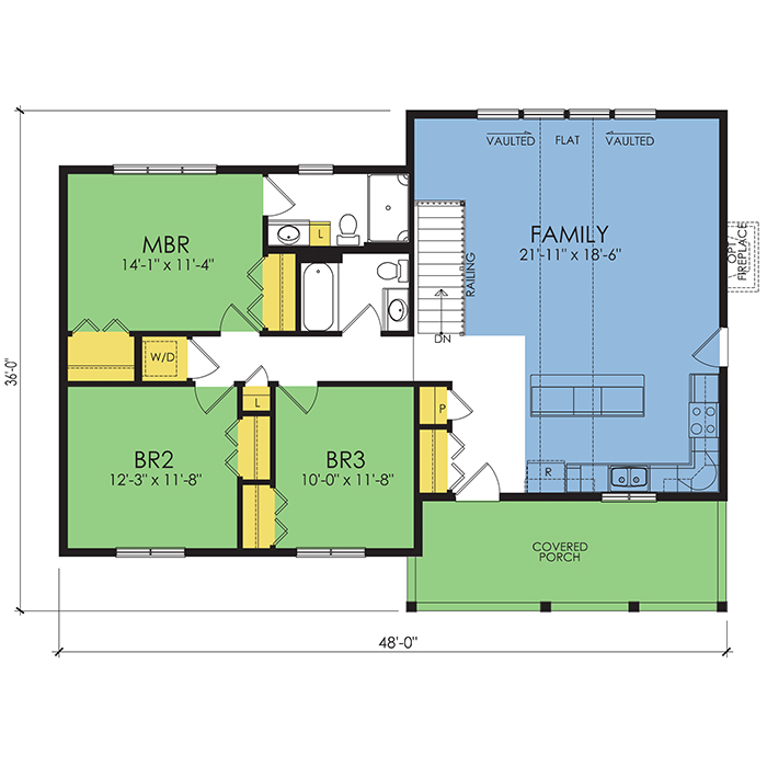 A part of our Wausau Originals, the White Pine floor plan features 3 bedrooms and 2 bathrooms with a foot print of 48x36 feet and 1348 total square feet of living space. Floor Plan #WO616