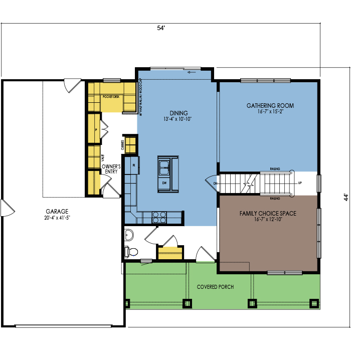 A part of our Family Series, the Yellowstone 2-story floor plan features 4 bedrooms and 2.5 bathrooms, a 2 car garage, a footprint of 54x44 feet, and 2527 total square feet of living space. Floor Plan #FM244